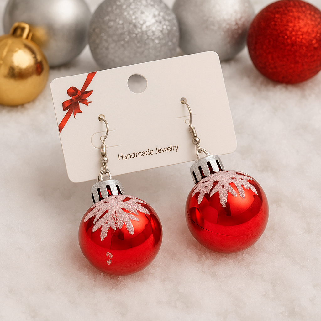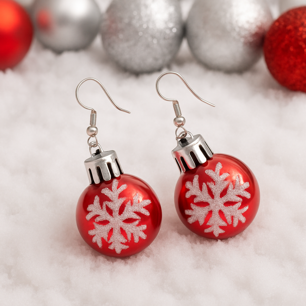 Add a touch of festive sparkle with these gorgeous red Christmas bauble earrings! Each earring features a glossy red ornament adorned with shimmering silver snowflake detailing and a secure silver hook. Perfect for holiday parties, markets, or cozy Christmas days — they bring cheerful charm to any outfit.