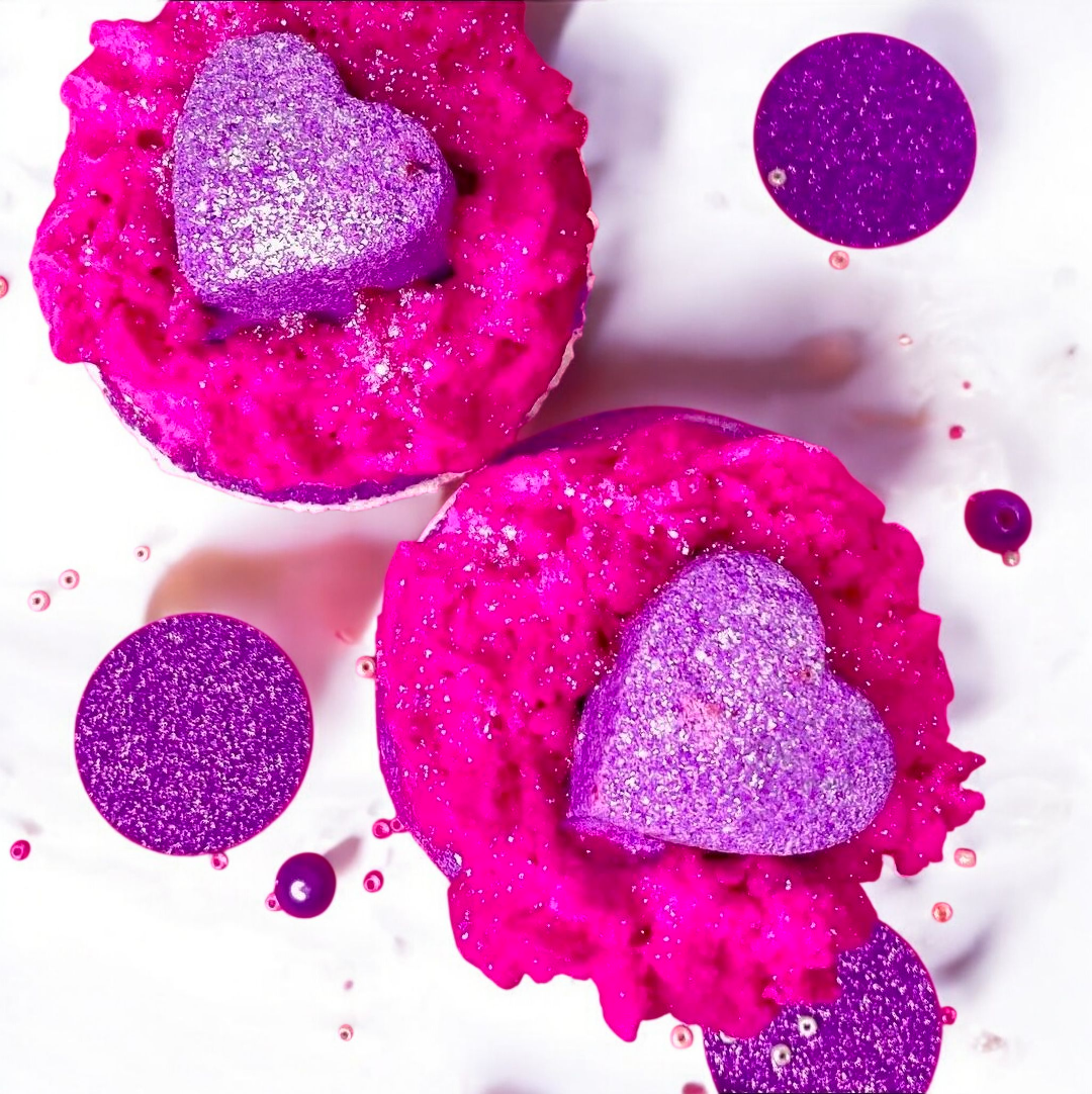 This indulgent bath treat features a soft cocoa butter frosting in vibrant pink, topped with a shimmering mini heart bath bomb that slowly reveals its magic as it fizzes. A beautiful blend of white, purple, and pink creates a stunning bath-time display while leaving your skin feeling nourished and pampered.