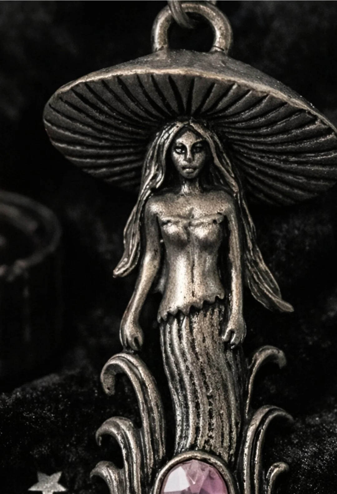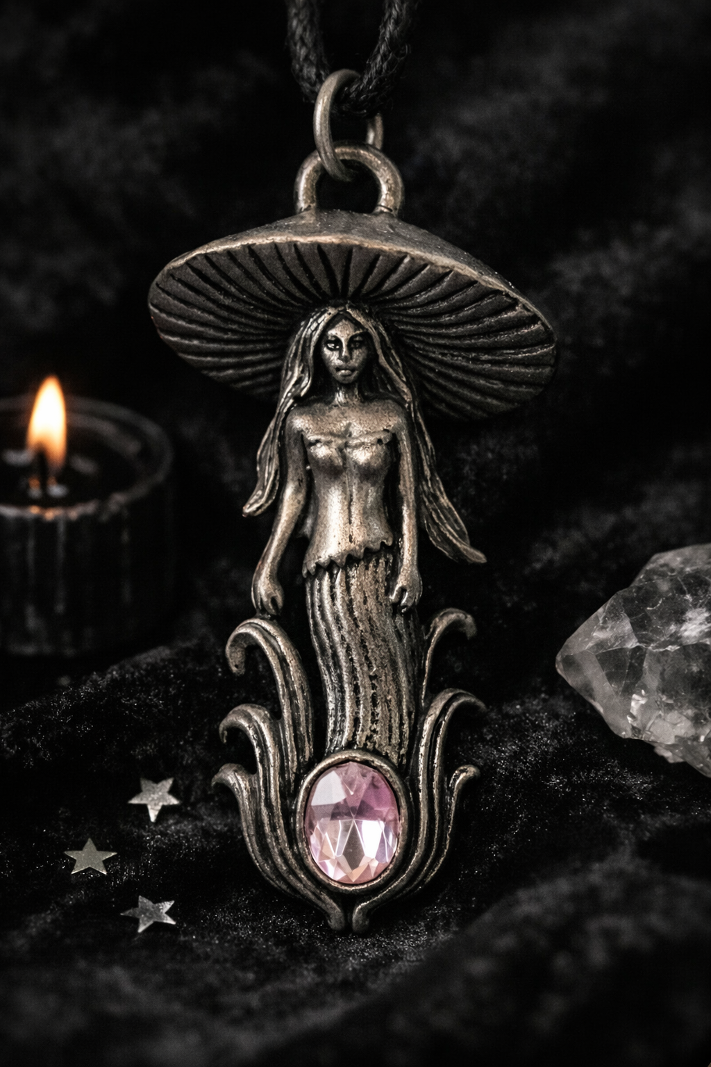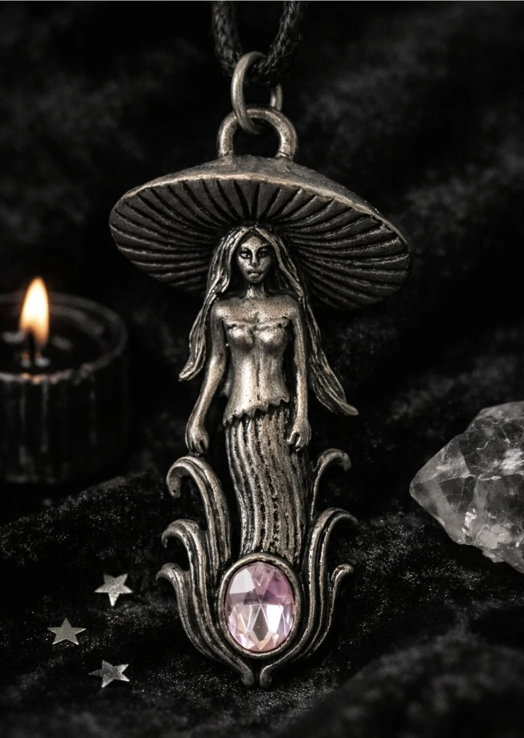 An enchanting mushroom fairy pendant, cast in an antique-style silver finish and set with a soft blush-pink crystal.